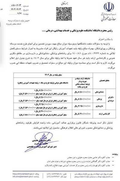 در این نامه آمده است: «با توجه به سوالات متعدد دانشگاهها، بدینوسیله میزان مبالغ جهت سپردن تضمین برای انجام طرح خدمت دو ساله پزشکان و پیراپزشکان به همراه مبالغ وثیقه بابت تعهدات آموزش رایگان این افراد مشروط به احراز شرایط دستورالعمل ابلاغی به شماره ۵۰۰/۳۷۲۲/ د مورخ اول آبان ۱۴۰۰ برای رشتههای پزشکی، دندانپزشکی و داروسازی در مقاطع دکتری عمومی و کارشناسی ارشد بابت هر سال تعهد، صرفاً با اخذ وثیقه ملکی برای سال ۱۴۰۳ به شرح جدول ذیل اعلام میشود: